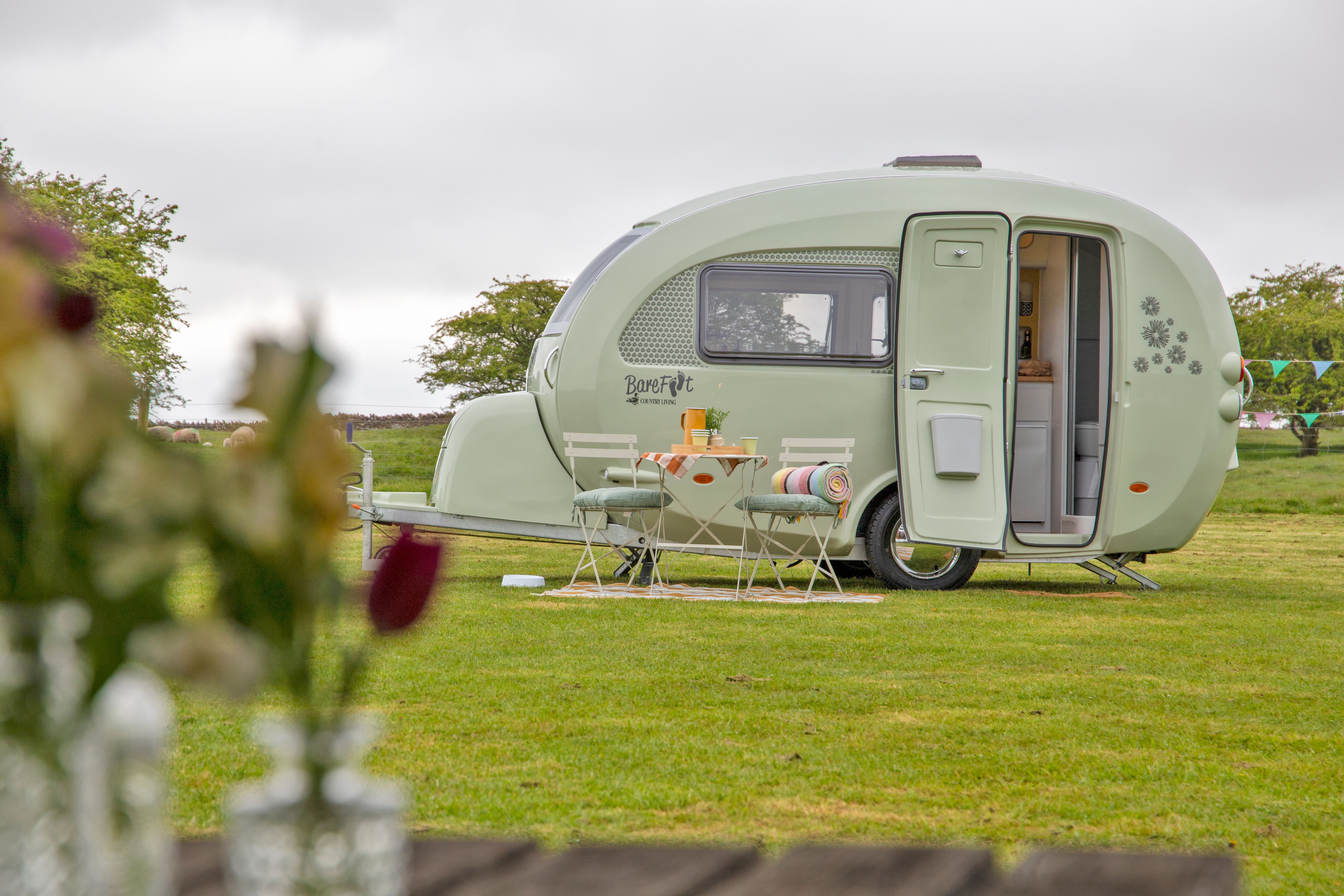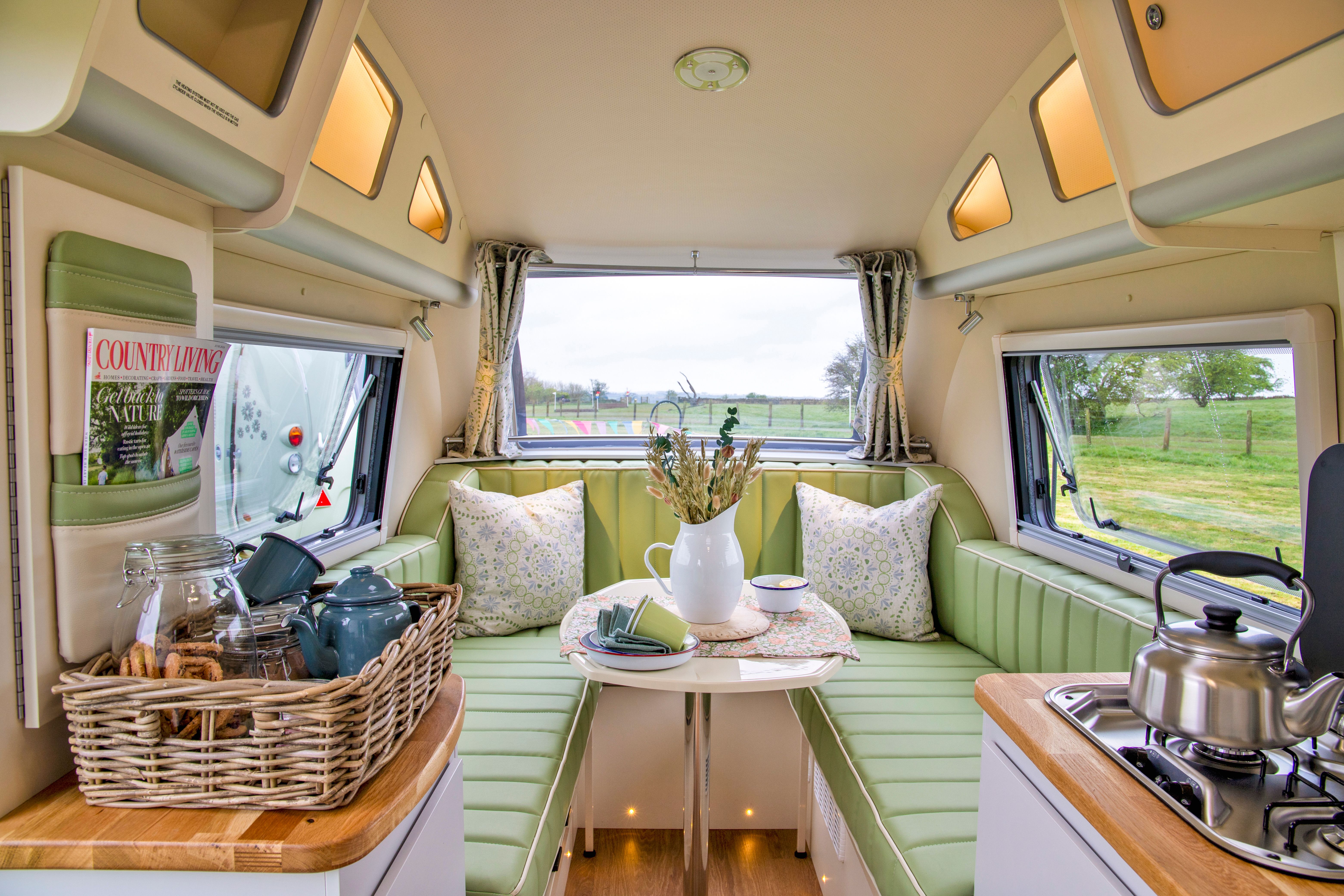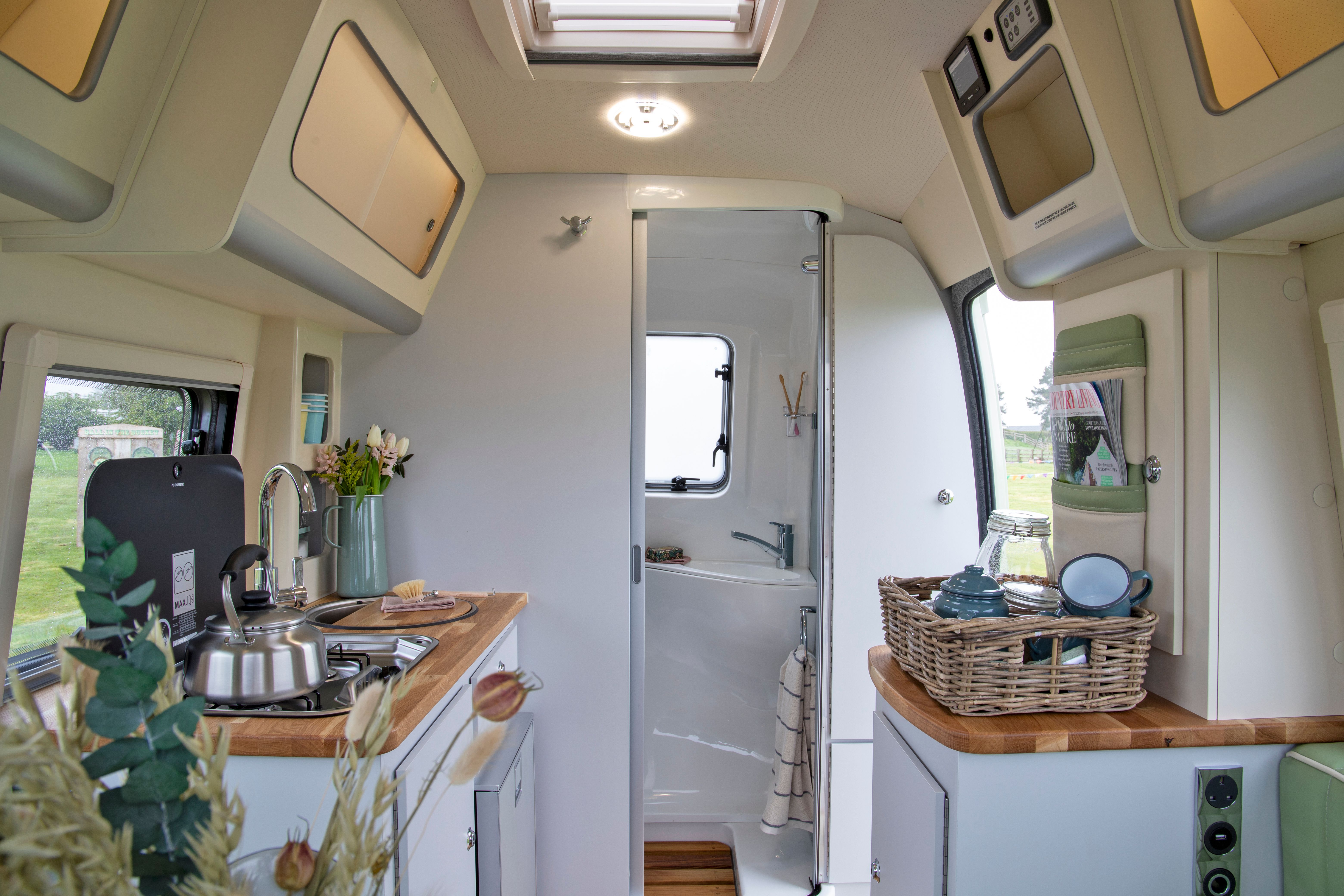 We will be showcasing our beautiful Country Living Barefoot Caravan in Northwick Green shown in the photos, and the many other options you can choose from to create your bespoke Barefoot. Beautifully fitted kitchen with oak worktops, hob, sink and 60L fridge, curved bathroom with a great shower and luxury living which converts to a king sized bed.